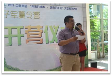 中新教服是隸屬于中新集團的一家專(zhuān)業(yè)提供教育行業(yè)管理和咨詢(xún)服務(wù)的專(zhuān)業(yè)化企業(yè),夏令營(yíng)開(kāi)營(yíng)儀式在學(xué)校一樓大廳隆重舉行。簡(jiǎn)短的開(kāi)場(chǎng)白后,主持人邀請活動(dòng)嘉賓中新教服總裁特別助理黃為民先生和小朋友代表分別上臺發(fā)言。緊接著(zhù),環(huán)保知識搶答環(huán)節將現場(chǎng)氣氛推向高潮,小朋友搶答并提出下一個(gè)問(wèn)題的模式調動(dòng)起了孩子們的積極性,孩子們天真可愛(ài)的回答引發(fā)了全場(chǎng)笑聲。9點(diǎn)40分,授旗儀式開(kāi)始,“我宣布,本次童子軍夏令營(yíng)正式開(kāi)營(yíng)!”嘉賓黃為民先生鄭重宣布。小代表從嘉賓手中接過(guò)旗幟,隨后,參營(yíng)的小朋友進(jìn)行集體宣誓,并合影留念。