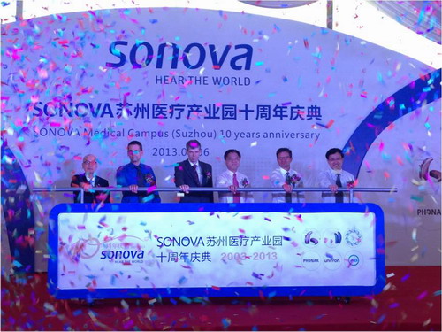 2013年9月6日,Sonova蘇州醫療產(chǎn)業(yè)園10周年慶典在蘇州工業(yè)園區舉行。作為全球聽(tīng)力保健系統的領(lǐng)跑者,瑞士Sonova集團自2003年落戶(hù)園區以來(lái),在園區管委會(huì )的大力支持下, 在社會(huì )各界的傾力幫助下,不斷發(fā)展持續壯大。集團于2009年自建新廠(chǎng)房,年產(chǎn)助聽(tīng)器240多萬(wàn)臺,成為集團全球最大的生產(chǎn)基地,并有力助推了園區醫療產(chǎn)業(yè)的發(fā)展。