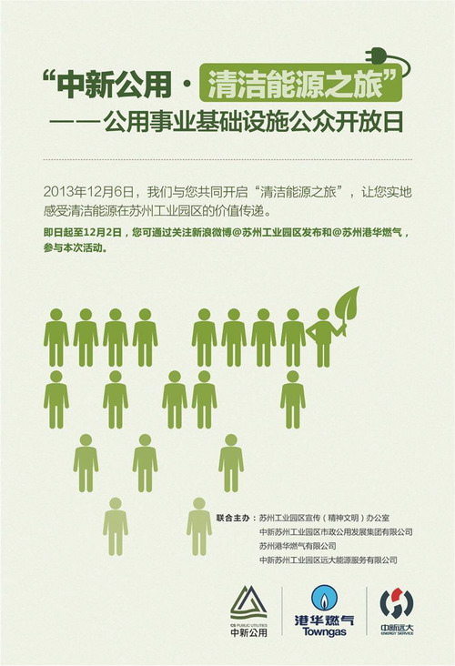 活動(dòng)由中新集團旗下中新蘇州工業(yè)園區市政公用發(fā)展集團有限公司(簡(jiǎn)稱(chēng)“中新公用”)聯(lián)合蘇州工業(yè)園區宣傳(精神文明)辦公室、蘇州港華燃氣有限公司、中新蘇州工業(yè)園區遠大能源服務(wù)有限公司舉辦。本次參觀(guān)活動(dòng)將于12月6日進(jìn)行。12月2日前,網(wǎng)友可通過(guò)新浪微博@蘇州工業(yè)園區發(fā)布 參加有獎?wù)心肌?br>
