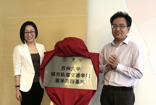 2014年5月15日,中新和喬與蘇州大學(xué)城市軌道交通學(xué)院教學(xué)實(shí)踐基地正式掛牌。中新和喬董事長(cháng)兼總經(jīng)理陸鈮、副總經(jīng)理蔡雅紅、副總經(jīng)理傅華、總經(jīng)理助理張磊,以及城市軌道交通學(xué)院院長(cháng)朱忠奎教授、副院長(cháng)肖為周博士、副院長(cháng)蔣志良副教授、施衛教授共同出席了儀式。
