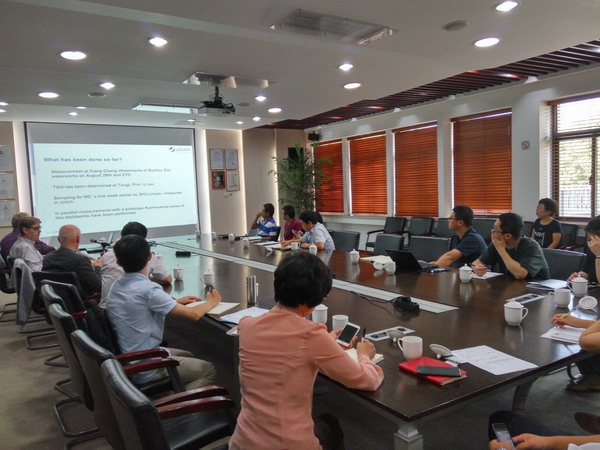 會(huì )議期間,Wido Schmidt博士作了“水質(zhì)研究和水處理在線(xiàn)監控技術(shù)報告”,就余氯衰減和消毒副產(chǎn)物控制、臭味物質(zhì)分析、藻毒素降解、水處理在線(xiàn)控制等方面與清源華衍人員進(jìn)行了詳細的交流。Stephan Küppers教授和Christian Moldaenke先生參觀(guān)了陽(yáng)澄湖取水口,并采集原水樣和陽(yáng)澄湖水廠(chǎng)過(guò)程水樣,使用BBE公司新研制的藻類(lèi)在線(xiàn)監測儀對各水樣進(jìn)行了現場(chǎng)檢測,并結合公司水質(zhì)檢測中心的檢測結果以及Stephan Küppers教授所在團隊的研究結果,和清源華衍技術(shù)人員展開(kāi)分析討論。