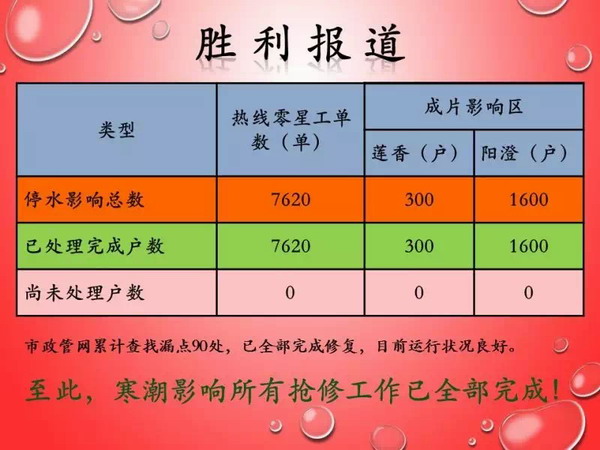 過(guò)去一段時(shí)間,寒潮引發(fā)供水系統管道和水表?yè)p傷和凍壞,困擾了蘇州工業(yè)園區部分小區和居民,給大家日常生活帶來(lái)不便。經(jīng)過(guò)不分晝夜的作業(yè)和不計代價(jià)的付出,1月30日,中新公用旗下蘇州工業(yè)園區清源華衍水務(wù)有限公司正式宣布,搶修工作基本完成,園區居民用水基本恢復正常,并向客戶(hù)表示感謝。