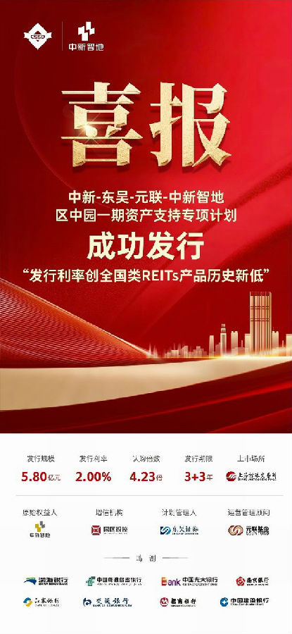 6月12日,中新集團旗下中新智地首單區中園REITs成功發(fā)行。本次發(fā)行以中新智地持有的鎮江、常州兩處區中園為底層資產(chǎn),產(chǎn)品整體規模5.8億元,期限3+3年,其中優(yōu)先級規模4.06億元,全場(chǎng)認購倍數達4.23倍,票面利率2.00%,創(chuàng )全國類(lèi)REITs產(chǎn)品歷史新低。