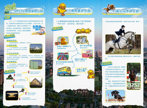 小黃鴨主題樂(lè )園總投資5000萬(wàn)元,占地150畝,創(chuàng )新采用故事線(xiàn)融入無(wú)動(dòng)力設施的設計理念,打造全齡段沉浸式親子游樂(lè )新地標。OFF-CITY野營(yíng)基地占地100畝,打造南通首家規模最大、內容最豐富、全家庭參與為核心的萌寵友好及生態(tài)體驗基地;推出首個(gè)帳篷節,突出“萌寵友好”與“創(chuàng )意露營(yíng)”相結合特色,并設“創(chuàng )意帳篷展示評選”活動(dòng)。森上馬術(shù)俱樂(lè )部聚焦高端運動(dòng)休閑,引入專(zhuān)業(yè)馬術(shù)課程與高品質(zhì)體驗項目,籌辦首屆南通市馬術(shù)錦標賽,積極推動(dòng)江浙滬馬術(shù)聯(lián)賽。